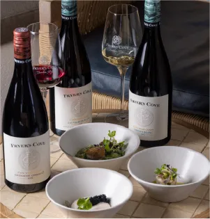 In 1999, the first vines of Fryer’s Cove were planted amongst beach vegetation with uninterrupted seaviews. This area, which is eight hundred and twenty meters from shore and about twenty meters above sea level, is sought after for its ideal climate which translates into the prominently unique flavour and character of Fryer’s Cove wine.
